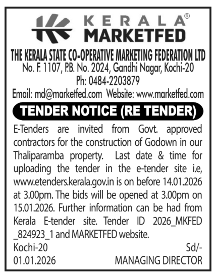 Kerala State Co-Operative Marketing Federation (MARKETFED) invites e-Tenders for the work of Construction of Godown Building at Thaliparamba from eligible Contractors possessing appropriate class registration in CPWD/ State PWDS/ Government Undertakings for executing this work.